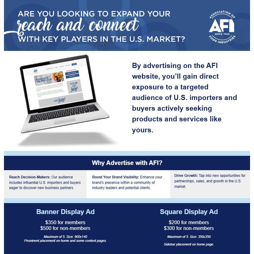 980 x 150px horizontal advertisement displayed on several key pages within the AFI website, linked to a URL of your choice. Your ad will rotate sequentially along with other advertisers during page loads. This advertising offers a larger size, more prominent placement and a higher impression rate.